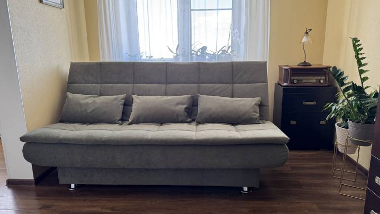 Специально искали диван без больших подушек. Именно эта модель привлекла своим функционалом и расцветкой.